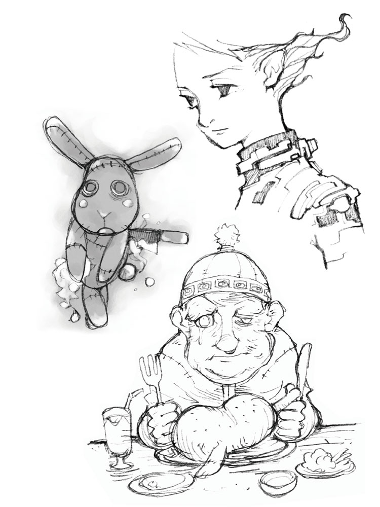 スケッチブックに描きめぐらされたらくがきの中から、なんか気になる絵だけスキャンして色つけたもの。